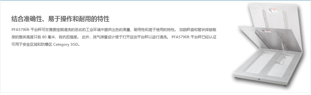 PFA579lift 平臺秤可在需要定期清洗的惡劣的工業(yè)環(huán)境中提供出色的測量、耐用性和易于使用的特性。 加固秤盤和管狀焊接框架的整體高度只有 80 毫米,有抗扭強(qiáng)度。 此外,其氣彈簧設(shè)計便于打開這些平臺秤以進(jìn)行清洗。 PFA579lift 平臺秤已經(jīng)認(rèn)證可用于安全區(qū)域和防爆區(qū) Category 3GD。