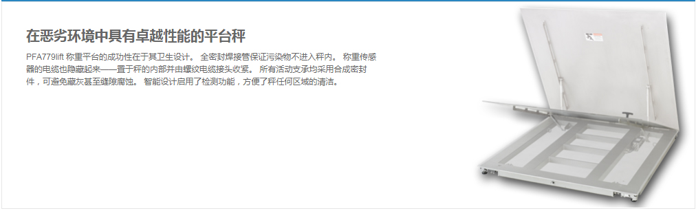PFA779lift 稱重平臺的成功性在于其衛(wèi)生設(shè)計。 全密封焊接管保證污染物不進入秤內(nèi)。 稱重傳感器的電纜也隱藏起來——置于秤的內(nèi)部并由螺紋電纜接頭收緊。 所有活動支承均采用合成密封件,可避免藏灰甚至縫隙腐蝕。 智能設(shè)計啟用了檢測功能,方便了秤任何區(qū)域的清潔。