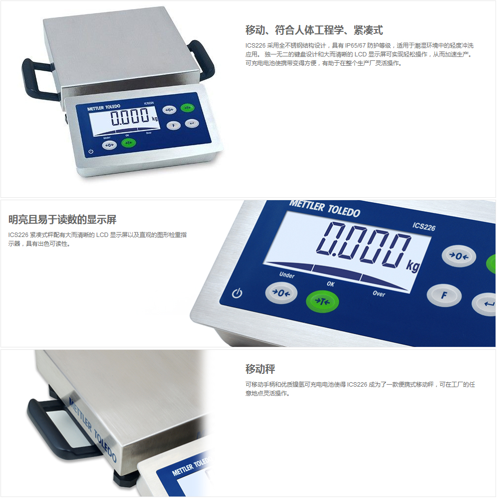 ICS226 采用全不銹鋼結構設計,具有 IP65/67 防護等級,適用于潮濕環(huán)境中的輕度沖洗應用。 獨一無二的鍵盤設計和大而清晰的 LCD 顯示屏可實現(xiàn)輕松操作,從而加速生產。 可充電電池使攜帶變得方便,有助于在整個生產廠靈活操作。