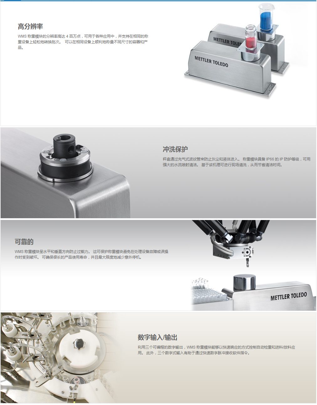 WMS 稱(chēng)重模塊的分辨率高達(dá) 4 百萬(wàn)點(diǎn),可用于各種應(yīng)用中,并支持在相同的稱(chēng)重設(shè)備上輕松地轉(zhuǎn)換批次。 可以在相同設(shè)備上順利地稱(chēng)量不同尺寸的容器和產(chǎn)品。