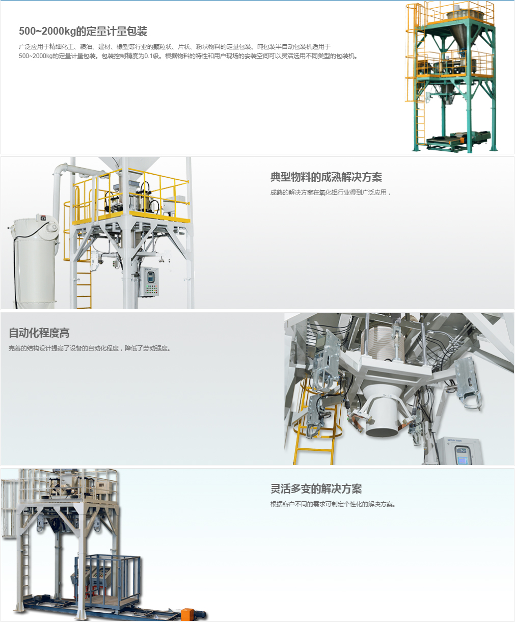 廣泛應(yīng)用于精細(xì)化工、糧油、建材、橡塑等行業(yè)的顆粒狀、片狀、粉狀物料的定量包裝。噸包裝半自動(dòng)包裝機(jī)適用于500~2000kg的定量計(jì)量包裝。包裝控制精度為0.1級(jí)。根據(jù)物料的特性和用戶現(xiàn)場(chǎng)的安裝空間可以靈活選用不同類型的包裝機(jī)。