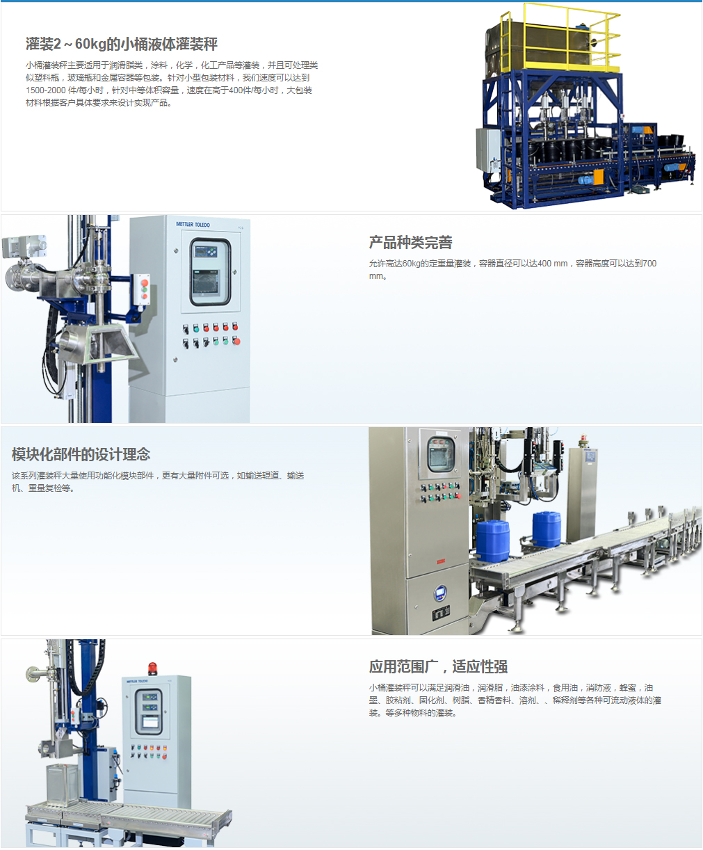 小桶灌裝秤主要適用于潤(rùn)滑脂類(lèi),涂料,化學(xué),化工產(chǎn)品等灌裝,并且可處理類(lèi)似塑料瓶,玻璃瓶和金屬容器等包裝。針對(duì)小型包裝材料,我們速度可以達(dá)到1500-2000 件/每小時(shí),針對(duì)中等體積容量,速度在高于400件/每小時(shí),大包裝材料根據(jù)客戶具體要求來(lái)設(shè)計(jì)實(shí)現(xiàn)產(chǎn)品。