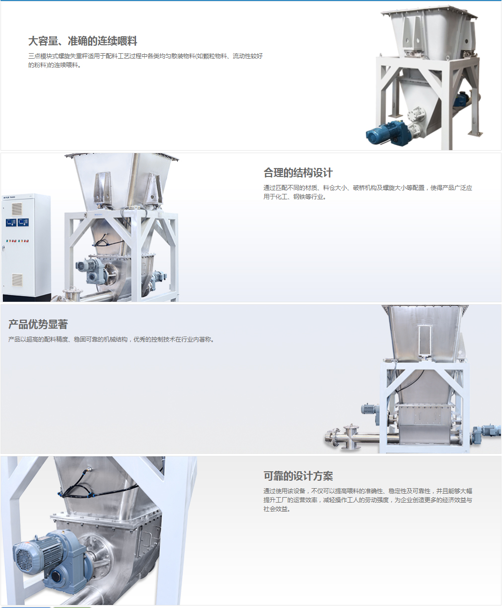 三點(diǎn)模塊式螺旋失重秤適用于配料工藝過(guò)程中各類均勻散裝物料(如顆粒物料、流動(dòng)性較好的粉料)的連續(xù)喂料。