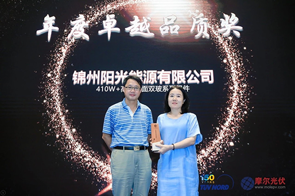 2019年8月22日,由TüVNORD和摩爾光伏主辦的第二屆雙面雙玻與平價上網(wǎng)技術(shù)路線研討會在蘇州召開,同時舉行了“2019光伏技術(shù)風(fēng)向獎”頒獎典禮。 “光伏技術(shù)風(fēng)向獎”旨在鼓勵光伏企業(yè)在推動光伏行業(yè)技術(shù)進(jìn)步,促進(jìn)光伏行業(yè)技術(shù)水平的提高與創(chuàng)新。眾多企業(yè)高管、行業(yè)專家、媒體代表約200余人參與了此次盛會,見證了這一光榮時刻。錦州陽光能源的410W+高效雙面雙玻組件憑借優(yōu)秀的產(chǎn)品性能榮獲“2019年度卓越品質(zhì)獎”。