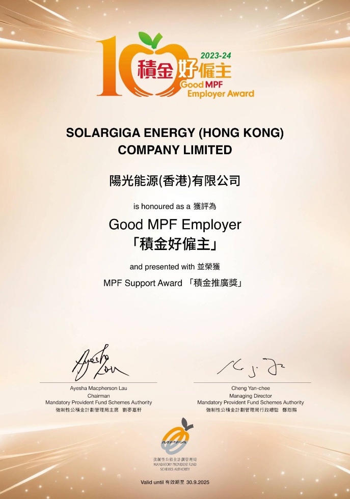 近日,陽光能源控股有限公司(以下簡稱“陽光能源”)旗下陽光能源(香港)有限公司憑借以人為本的理念和企業(yè)社會責任的踐行,被香港強制性公積金計劃管理局(MPFA)授予“積金好雇主”稱號和“積金推廣獎”榮譽,是陽光能源推進集團 ESG 工作的重要實踐,更是香港政府機構(gòu)對我司建設(shè)優(yōu)秀雇主品牌、踐行 ESG 理念工作的充分認可。
