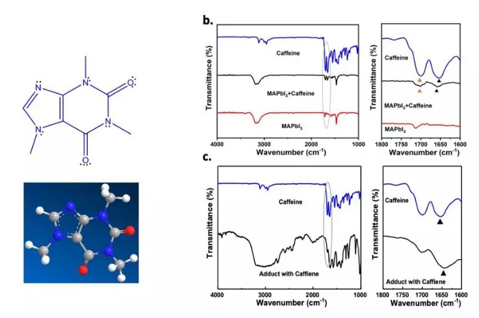 楊陽(yáng)研究小組用加熱的方法將咖啡因添加到40個(gè)太陽(yáng)能電池的鈣鈦礦層中,并使用紅外吸收光譜來(lái)確定咖啡因是否成功地與鈣鈦礦結(jié)合了。他們發(fā)現(xiàn)了咖啡因在與鈣鈦礦結(jié)合后,咖啡因中的羰基的特征峰發(fā)生了移動(dòng),這意味著咖啡因已經(jīng)成功與鈣鈦礦結(jié)合了。