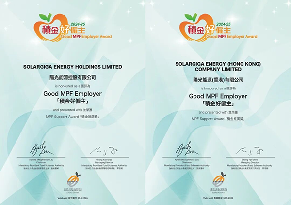 2025年11月25日,香港強制性公積金計劃管理局(MPFA)公布了2025年度“積金好雇主”獲獎名單,陽光能源控股有限公司(以下簡稱“陽光能源”)及旗下陽光能源(香港)有限公司雙雙獲得2025年度“積金好雇主”稱號與“積金推廣獎”榮譽。