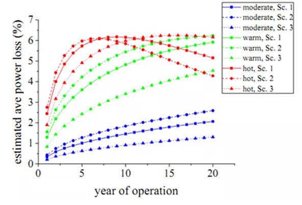 結(jié)果如圖所示,在炎熱地帶,年發(fā)電損失約達到5%,當達到最大衰減以后,第7年以后組件在熱輔助的作用下開始功率恢復,但是恢復的程度有限,需要花費的時間也很長,如圖則需要10年以上。在溫暖地區(qū),第5年功率衰減達到4%左右。在中性氣候地區(qū),影響較小。